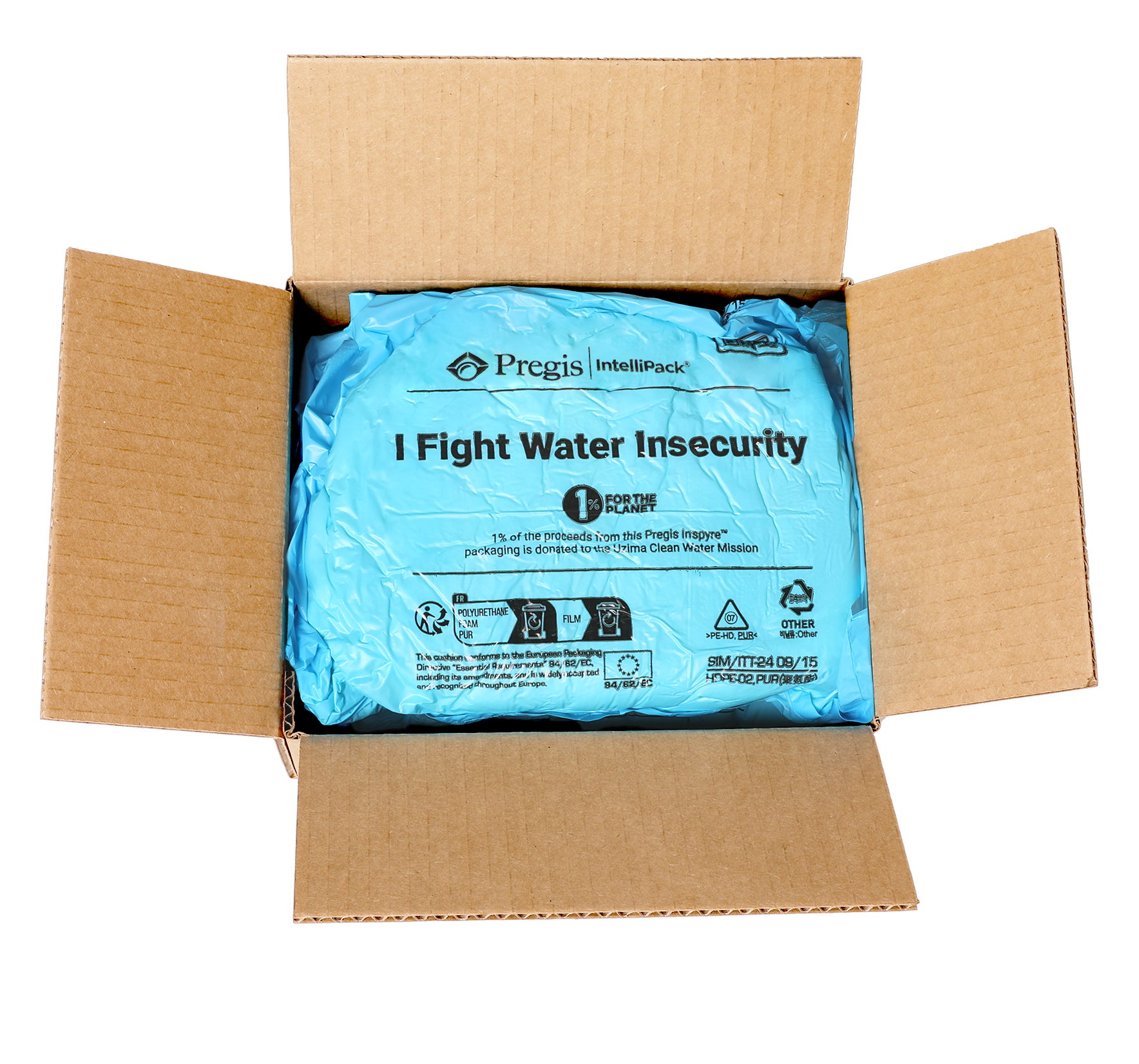 Pregis IntelliPack® Inspyre™ Film shown in use, delivering custom-fit protection while reinforcing brand purpose with the message “I Fight Water Insecurity.” One percent of proceeds support clean water access through the Uzima Clean Water Mission.